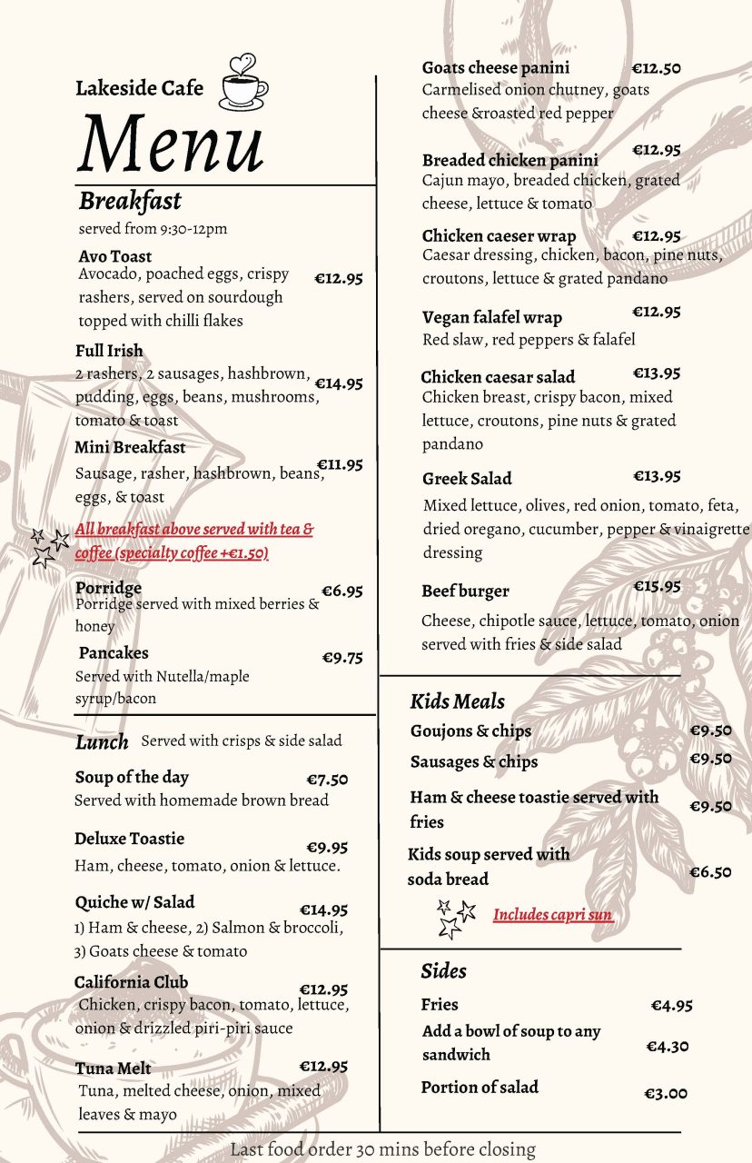 Start your day with great coffee and a pastry, break for a delicious lunch with stunning views of Lough Ennell, or enjoy tea and cake in the afternoon while nature puts on Her best show.